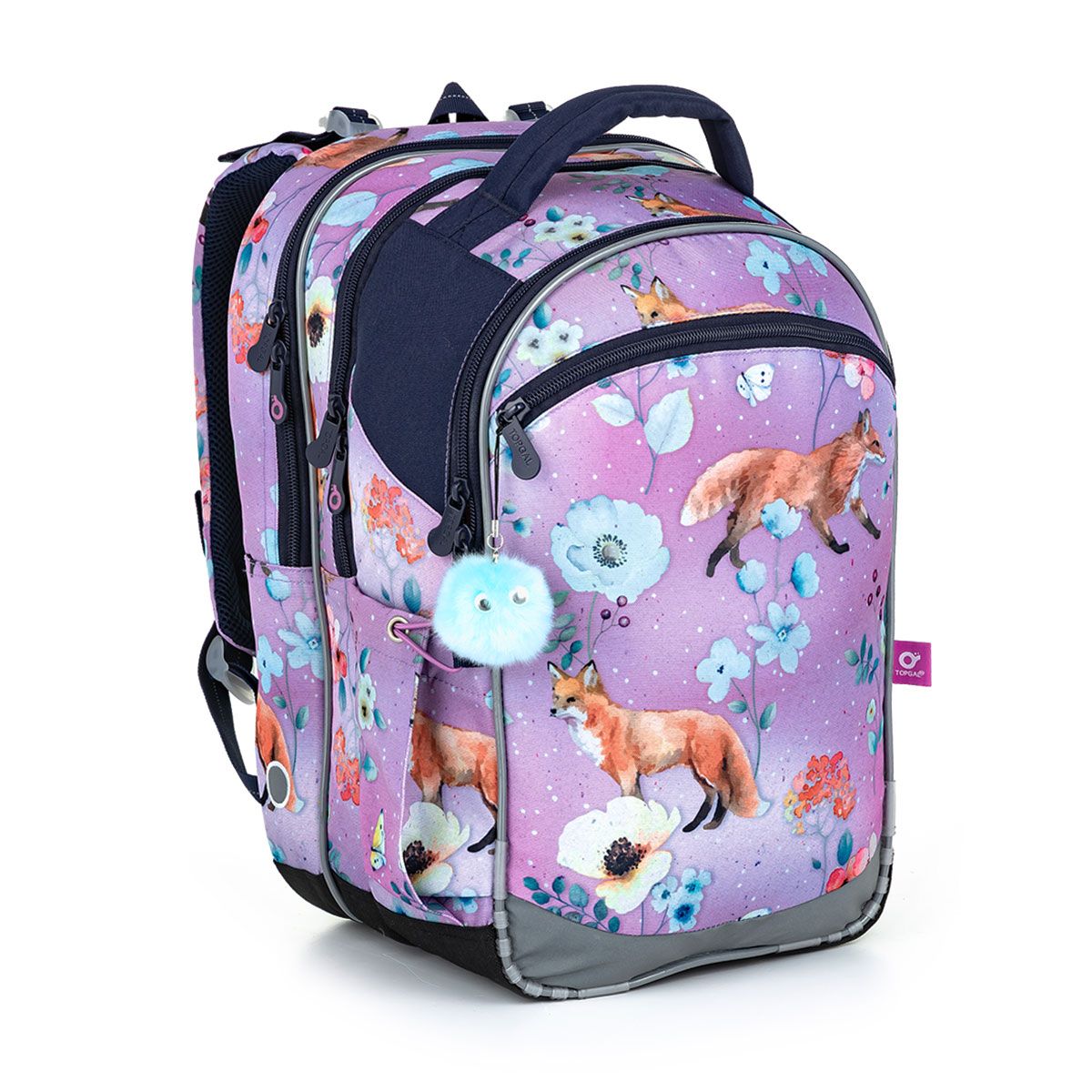 Taška COCO je vďaka trom komorám zrejme našim najuniverzálnejším strihom z celej kolekcie školských tašiek. Vyhovuje ako prváčikom, tak aj piatakom, vďaka svojmu objemu. Tento rok na akvarelom poňatom motíve s líškami a kvietkami na fialovom pozadí.