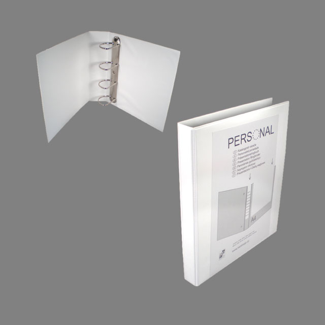 4-krúžkový zakladač na formáty A4, s prezentačnou prednou stranou, farba: biela, priemer krúžku 20 mm, šírka chrbta 35 mm.